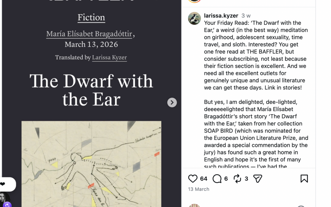 María Elísabet Bragadóttir rithöfundur gerir það ekki endasleppt. Nýverið fékk hún sína fyrstu smásögu birta í einu svalasta menningarriti sem gefið er út í New York: The Baffler. Sagan um Dverginn með eyrað, þýdd af Larissu Kyser, birtist í mars í Baffler sem er leiðandi vettvangur í Bandaríkjunum fyrir hvassa og óhefðbundna stjórnmálagagnrýni, menningarumfjöllun, smásögur, ljóð og myndlist.