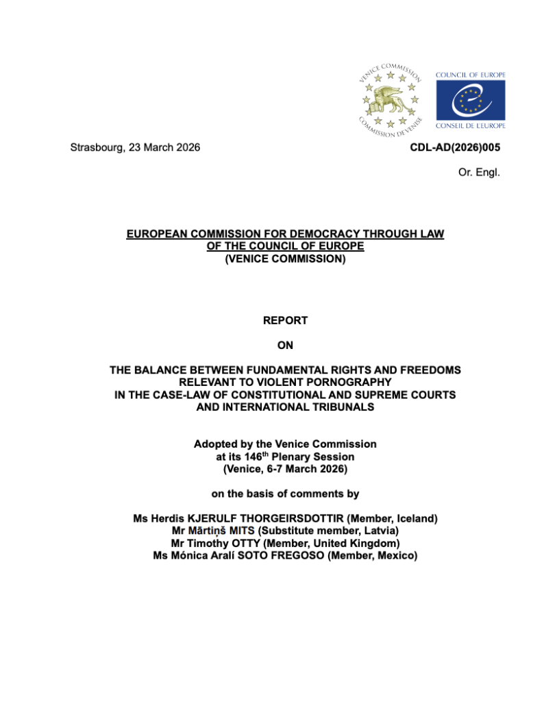 Jafnréttisnefnd Evrópuráðsþingsins fór þess á leit við Feneyjanefnd í loks síðasta árs að unnin yrði skýrsla um dómaframkvæmd alþjóðlegra dómstóla og æðstu dómstóla innan ríkja um mörk grundvallar mannréttinda og ofbeldisfulls kláms. Skýrsluna unnu Herdís Kjerulf Þorgeirdóttir, Tim Otty frá Bretlandi, Mits Martin frá Lettlandi og Monicu Arali Soto frá Mexíkó. Hún var lögð fyrir aðalfund Feneyjanefndar 6. mars 2026 til samþykktar. Sjá skýrslu hér.